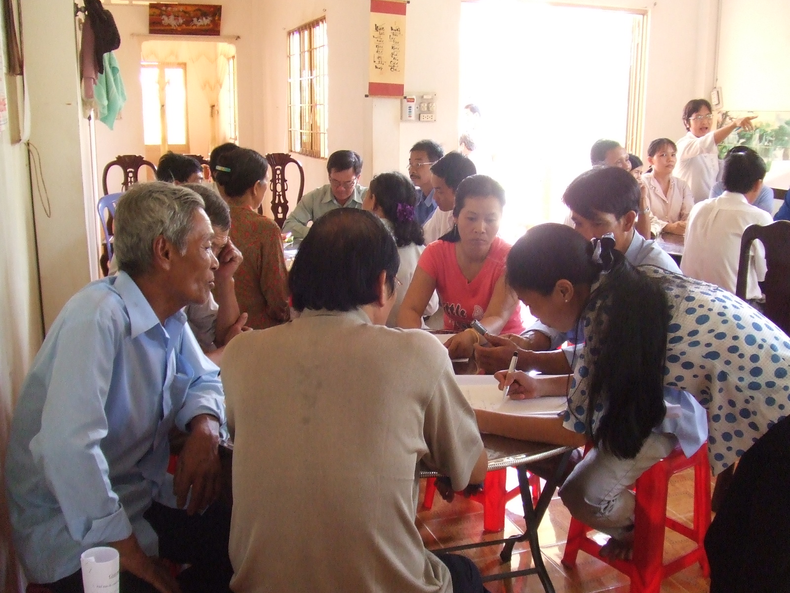 参加者は4つのグループに分かれ、アヒル水稲同時作を実践して感じた困難な点や良かった点などを話し合い、困難な点を克服するための解決策をまとめ、今後の活動計画を作りました。参加者の一番の関心は、ベトナム国内の他地域でどのようにアヒル水稲同時作が行われているのか、ということです。また、ホアビン省タンラック郡の地域づくりにも強い関心が寄せられました。